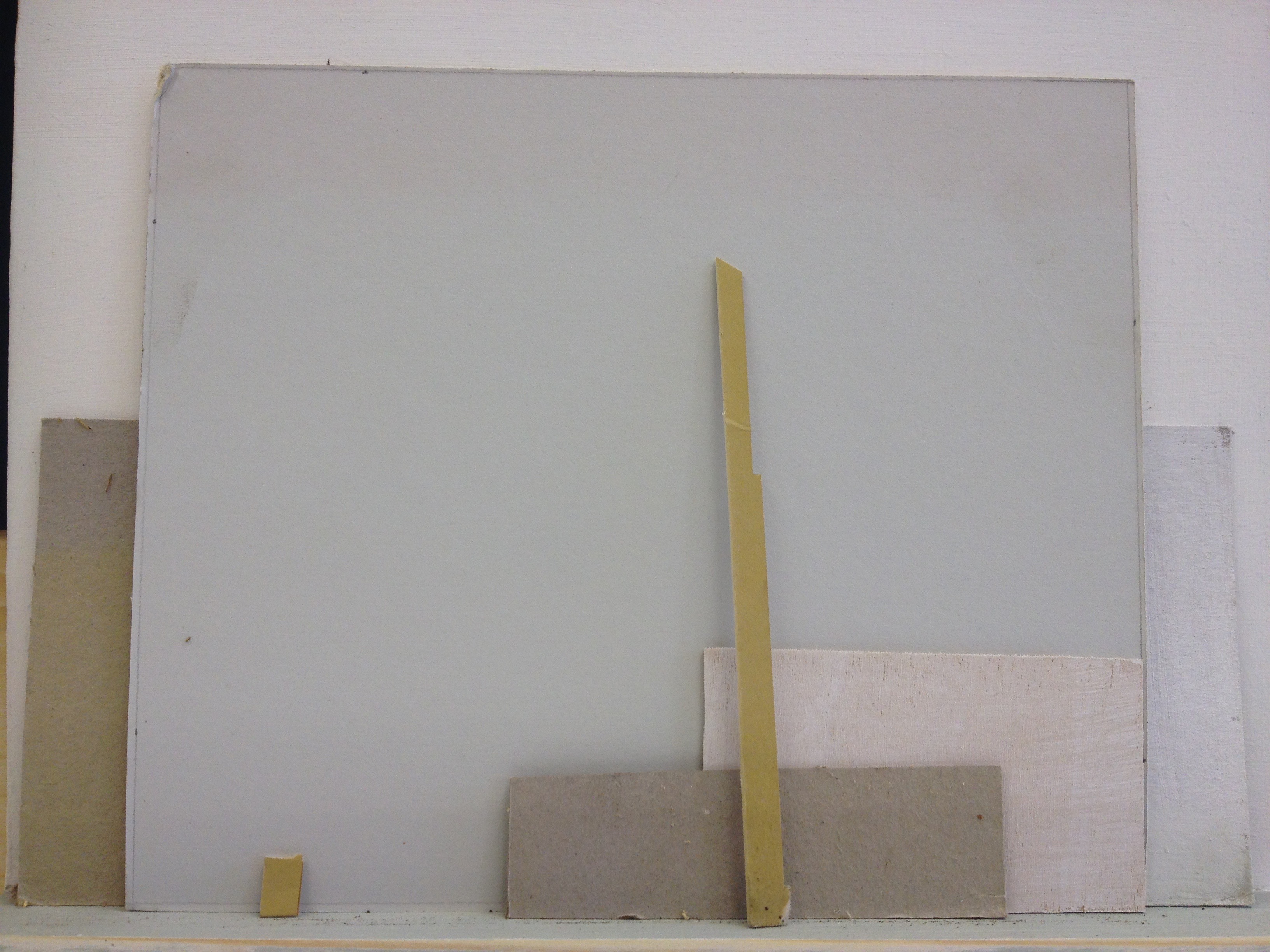 informal arrangements [which are simultaneously formal assemblages, leaning against the wall] with things lying around in the studio. The maths is important – equally important to dead reckoning / trial and error / knowing when it’s ‘right’ ….Baumgarten’s sensuous knowing in play again.