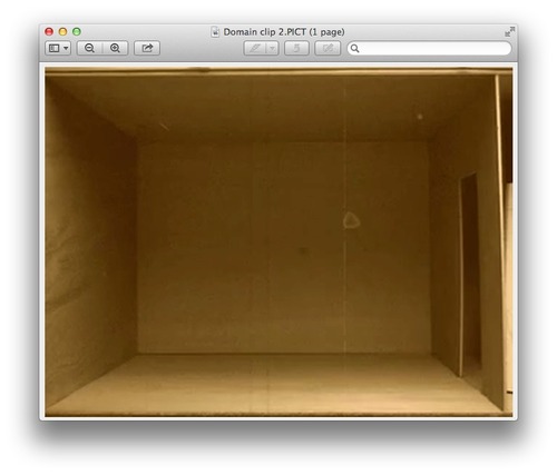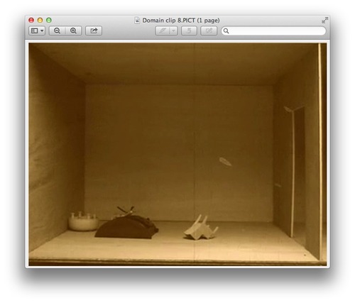My film deals with a similar issue but in this case the studio is reduced to a model and artistic activities are miniaturised in a series of ‘Gulliver-esque’ tableaux or enactments – each one punctuated by the close of a stage curtain. In a way my film consciously tends towards ‘the reproduced’, the constructed stage, film or theatre set in its depictions of a series of avalanches and visually references old slapstick humour films in a sequence of ‘vignettes’. The strange beauty of this apparently absurd process experienced in the studio is foregrounded in this ‘homage’.