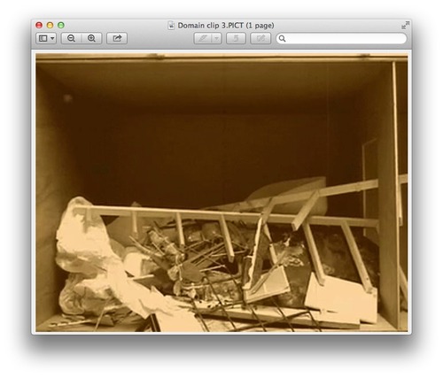 The film stemmed from a conversation that started between Steve Dutton and myself about the catastrophes that result from trying to deal with landslides of material from abandoned artistic activities which often end up strewn chaotically across the studio. Dutton and Peacock made a film called ‘Plague-Orgy-Time’ in 1997 and I first saw it in their exhibition ‘Apocatropes’ at the Mappin Gallery in the same year. I was taken by their approach to a ‘series of accretions of things in a space punctuated by scattered evidence of artistic activity’ (Glover, I. 1997).