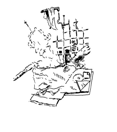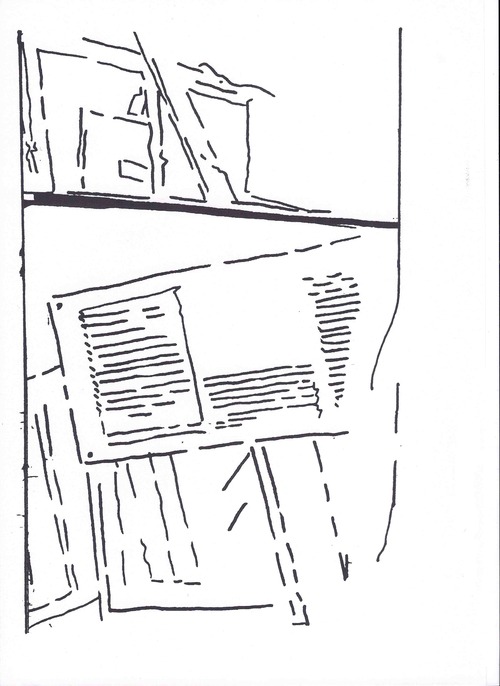 The subjects of these drawings i.e. tableaux, installations, are manipulated like collages – cut up and moved around, inverted, and similarly the drawings are produced in this way and can be initially understood as drawing sites exploring the un-making and the unfinished nature of the work.